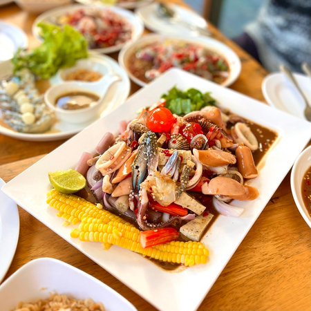 Seafood Somtum has clams, shrimp, crabs, boiled eggs, grilled tilapia, placed in a beautifully placed tray on a wooden table.Thai food style.