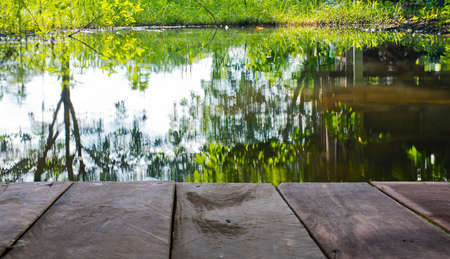 Wooden floor and reflection of trees in the lake in the park