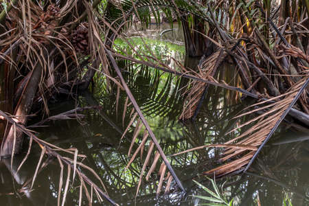 Canal flowing through rows of dwarf coconut trees with coconuts hanging low, tropical farm in Thailand