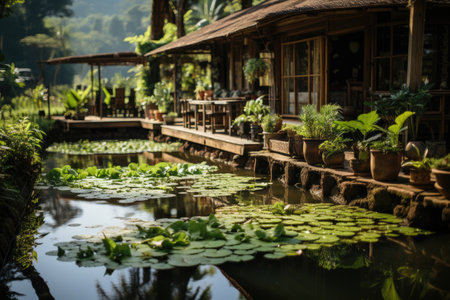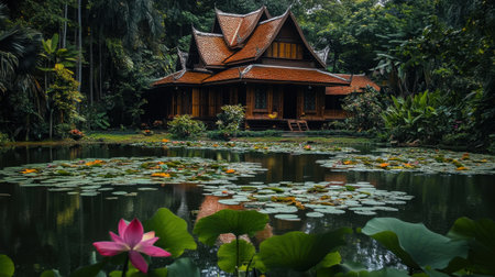 This image captures a tranquil traditional house nestled in a lush landscape, with a serene pond filled with blooming lotus flowers. The peaceful setting invites relaxation and showcases the beauty of nature.