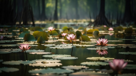 Tranquil ponds reflect verdant canopy lily pads float serenely wallpaper