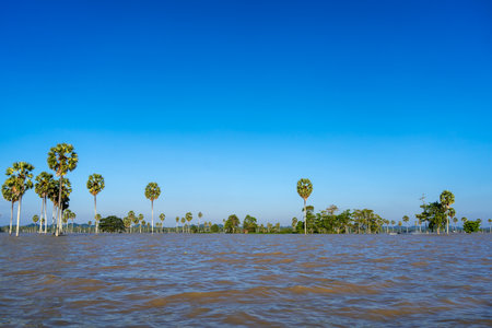 Floating mangrove forest near the Kampong Phluk Floating Village and Angkor Wat, Siem Reap, Cambodia. The trees standing in the water during high tide, boats cruising through