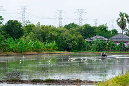 Wide shot of a field where the broker is full of water and many white birds are foraging in the field, behind the field there is a high voltage pole.
