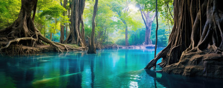This captivating image showcases a lush mangrove forest, where tall trees rise from calm waters, reflecting a vibrant tapestry of green. The serene atmosphere invites peaceful contemplation and highlights the beauty of nature in a tropical environment.