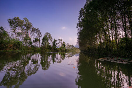 Jungle at sunset near Tangalle, Sri Lanka. Scenery of tropical river, lagoon in rainforest in the evening. Landscape of wetland, ocean forest. Theme of nature, wildlife, water, calm and travel.
