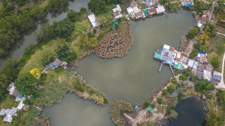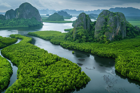 Aerial view of the island group with mangrove forests and rock formations in phang nga, thailand. a large river meanders through lush green vegetation leading to an expanse of water under grey sky. in front is an area covered by black holes for shrimp farming, and behind it lies more rocky islands.