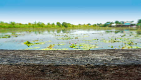 Wooden plank with blurred lake background.