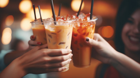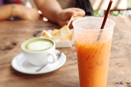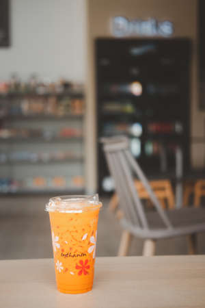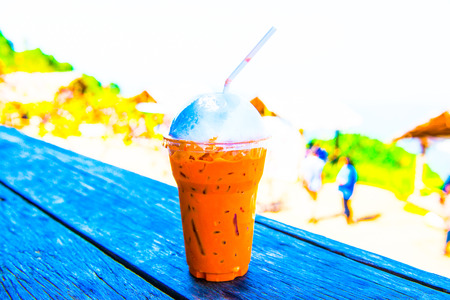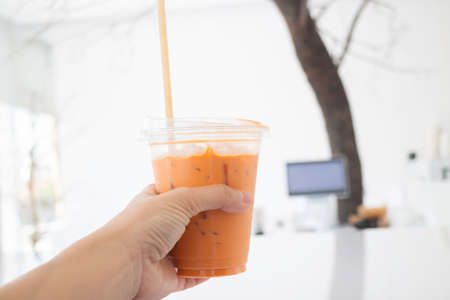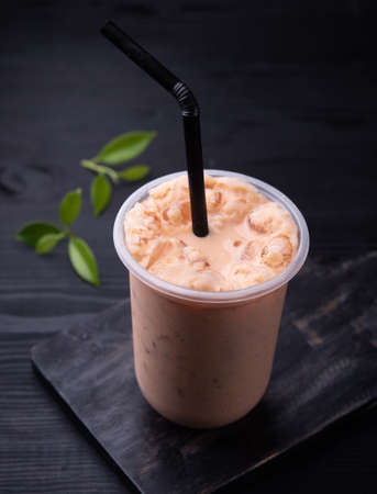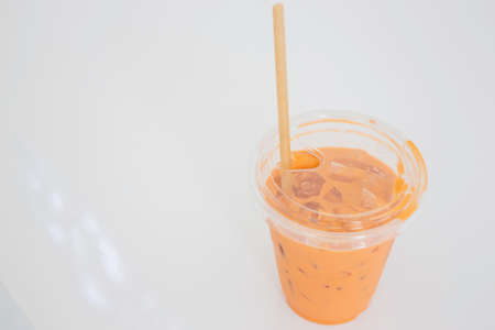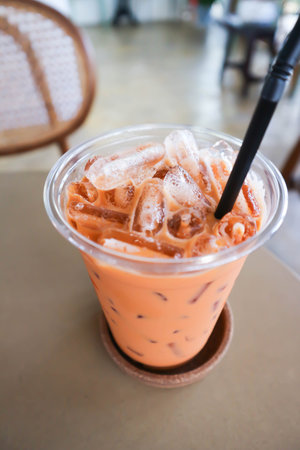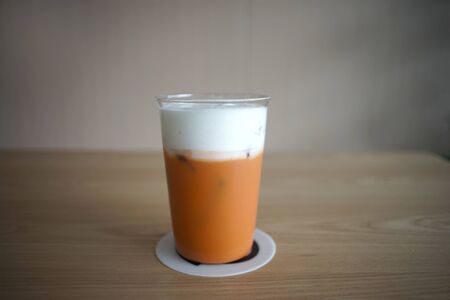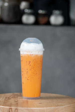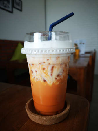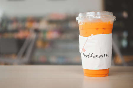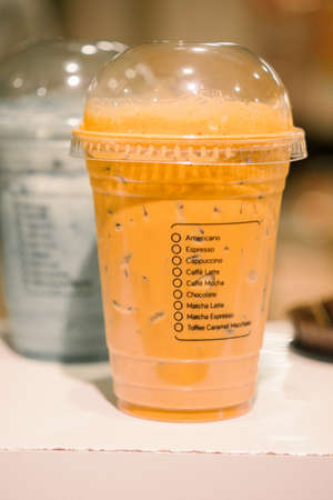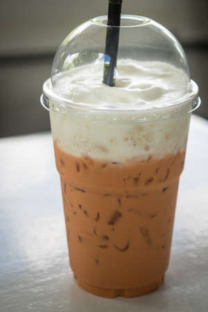 Milk ice tea in takeaway plastic cup on table in cafe, Thailand