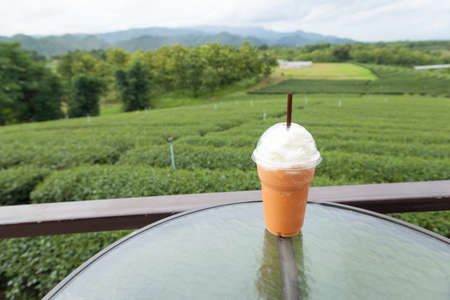 Iced tea on the table Tea Plantation near agricultural plantations in the mountains.