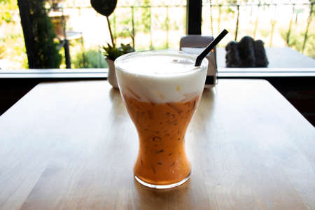 A glass of Thai milk tea on wood table at cafe, Thai milk tea, is a traditional Thai drink that has long been popular.