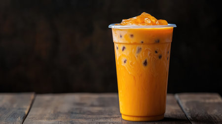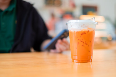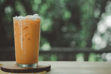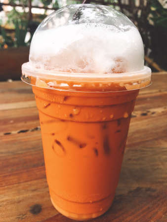 Ice Thai tea in clear plastic cup famous beverage drink traditional on wooden table in nature cafe, copy space