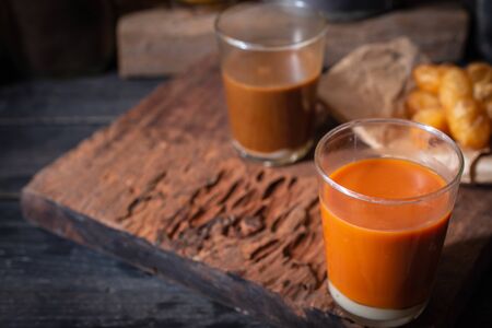 Thai Milk Tea, Milk ice tea, Cheddar is a traditional Thai drink that has long been popular, fresh and sweet dessert on a wooden saucer, vintage wooden table in cafe.