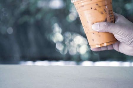A man hand holding a glass of Thai tea. Thai milk tea is a famous beverage drink traditional
