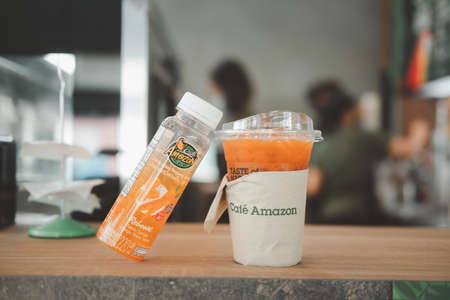 Samut Prakan, Thailand - March 28, 2021 : New beverage natural choice 100%, cold pressed juice Reboost recipe : ingredients of carrot, orange, mango and green apple from Amazon cafe brand.