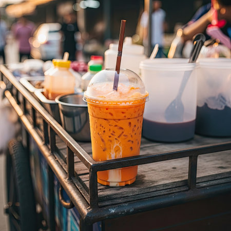 An orange-colored iced tea in a clear plastic cup sits atop a street vendor's cart. The beverage includes a straw and is surrounded by other containers and bottles. The scene is brightly lit and suggests a daytime outdoor environment, potentially useful for advertising or lifestyle content.
