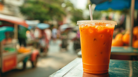 A vibrant orange iced beverage in a clear cup sits on a table in a lively urban setting, surrounded by people and street vendors, capturing summer joy.