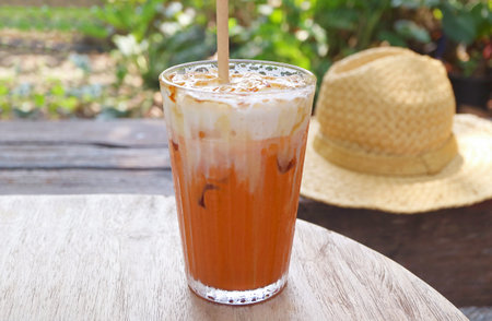 Glass of Mouthwatering Thai Iced Tea Isolated on Garden Table