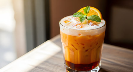 A glass of refreshing iced Thai tea topped with creamy milk foam and a sprig of fresh mint. The vibrant orange beverage sits on a wooden table, highlighted by natural lighting that emphasizes its cool and thirst-quenching appeal.