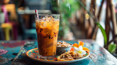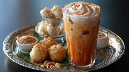 A glass of Thai iced tea with a side of traditional Thai snacks on a colorful plate
