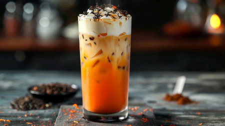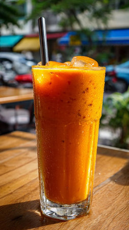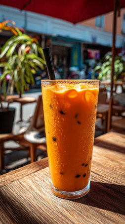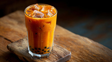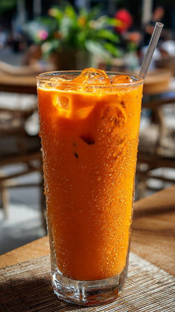 Traditional Thai iced tea in a tall glass, served chilled. Orange-colored tea with ice, in a cafe setting. Concept of refreshing beverages, Thai cuisine, summer drinks, Asian refreshment. Copy space