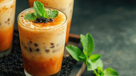 A delicious iced beverage featuring creamy milk, sweet tapioca pearls, and a fresh mint garnish. Perfect for hot summer days or as a delightful dessert.