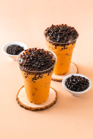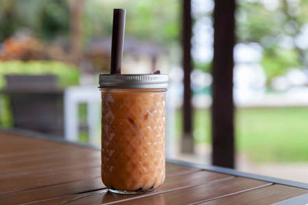 Iced Thai Milk Tea with Bubbles on Table in Coffee Shop