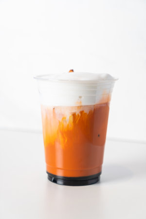 Tall plastic glass of Thai iced milk tea with foam milk
