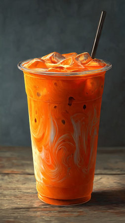 Refreshing Iced Thai Tea Drinks with Ice and Spices on Peach Background
