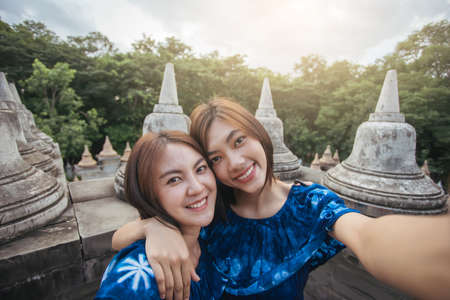 Two friend Asian woman happy smile selfie with attractions pagoda of the buddhism.