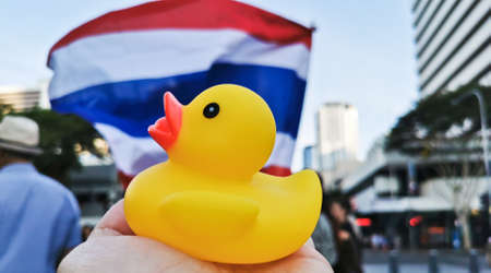 BRISBANE, AUSTRALIA - NOVEMBER 29, 2020: Yellow rubber duck represents a sympbol of innocent people in the peacefully rally at King George Square, City Hall, in Brisbane Australia to protest the dictatorship of the prime minister Prayuth Chan-ocha in Thai