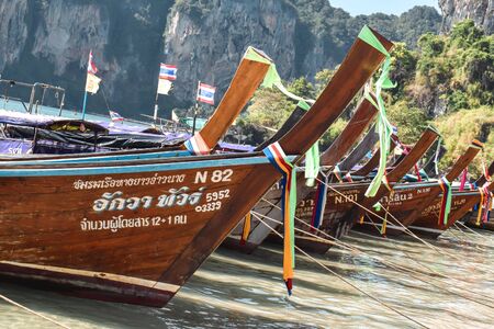Line of long tail boats parked on a beach in Krabi Thailand