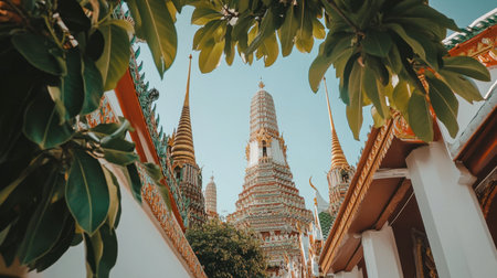 Explore a stunning Thai temple framed by vibrant greenery. The intricate architecture and serene atmosphere offer a beautiful representation of cultural heritage.