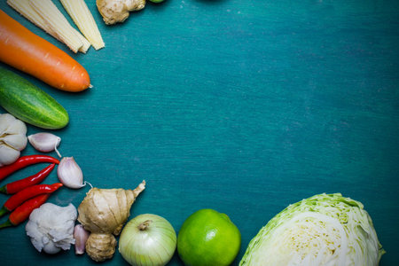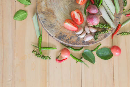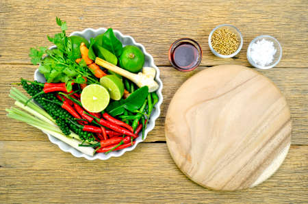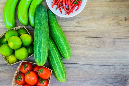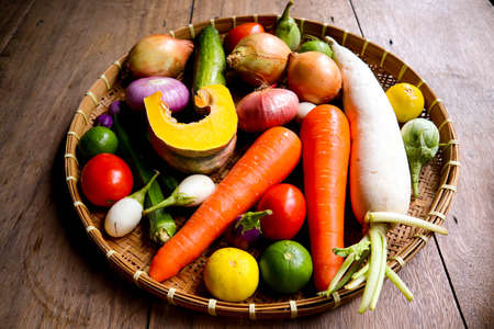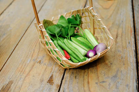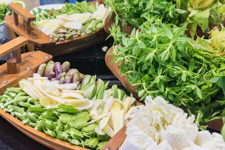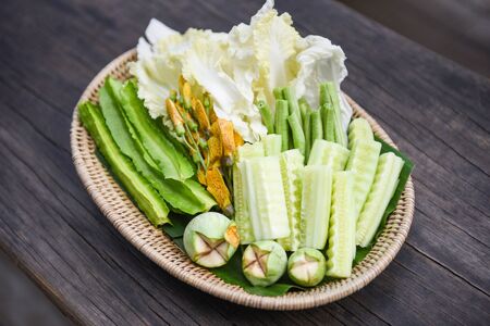Set of Thai fresh vegetable for eat with Thai food on wood dish. Concept of healthy eating