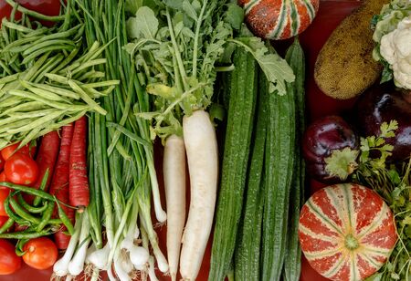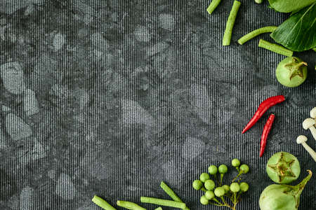Organic Southeast Asian vegetables from local farmer market in Thailand, Sustainability concept, Table top view
