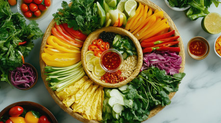 A vibrant arrangement of fresh vegetables and herbs served on a wooden platter. Includes various dips and sauces that complement healthy eating. Perfect for gatherings.