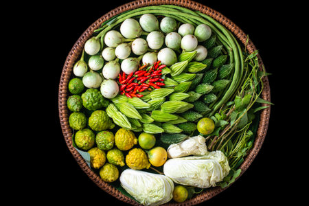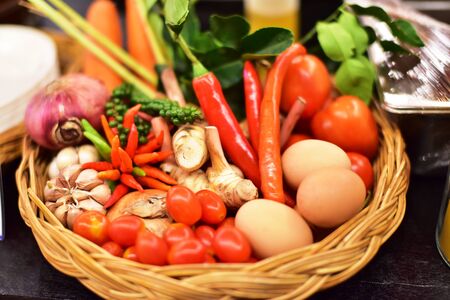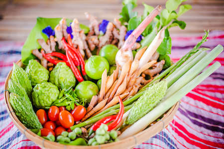 Fresh Asian herb and spicy ingredients food in bamboo basket