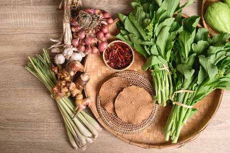 Thai Traditional Local Food : Spicy Shrimp Paste Dip or Fried shrimp paste sauce (Nam Prik Kapi) with blanched vegetables and cha-om omelets on wooden backgroud.