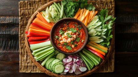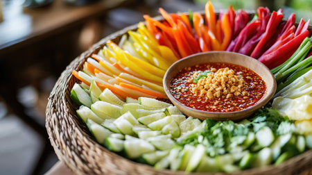A traditional Thai dish featuring a bowl of served with an assortment of fresh vegetables, such as cucumber, carrots, and green beans, ready for dipping.