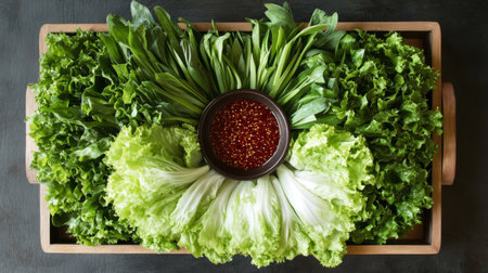 A top-down view of a serving tray filled with crisp, fresh vegetables like lettuce, morning glory, and eggplants, with a small bowl of spicy chili paste in the center.