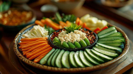 A vibrant fresh vegetable platter with a variety of colorful vegetables and a delicious dipping sauce, perfect for healthy snacking or appetizers.