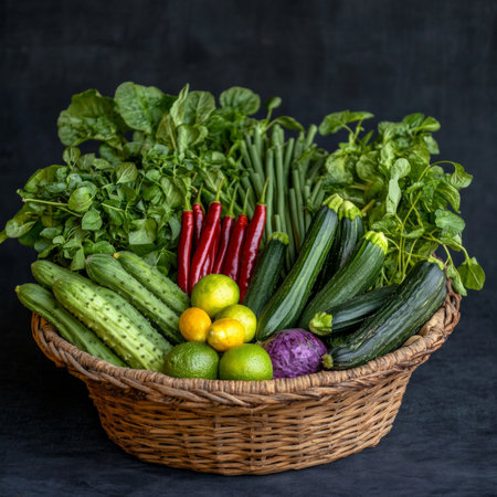 fresh vegetable, chillis, cucumber, thai eggplants, green okla, lemons, kaffir lime, green, red, blue, basket