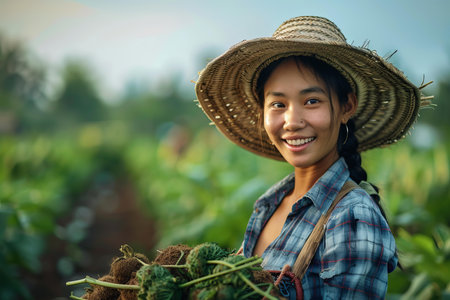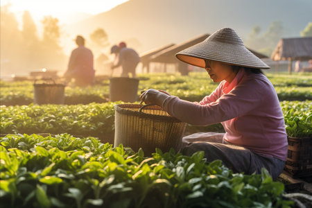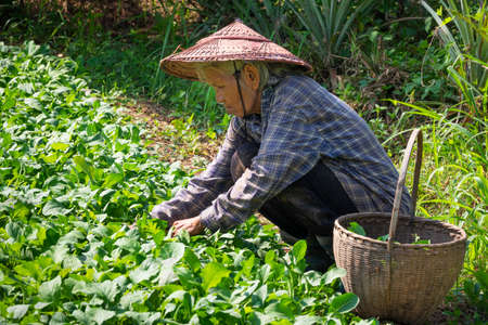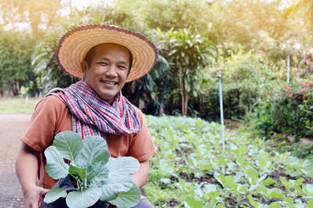 The Gardeners in a wicker hat works in an organic vegetable plot in the morning, The Farmers inspecting the horticulture inside the nursery.