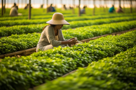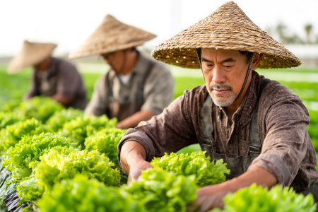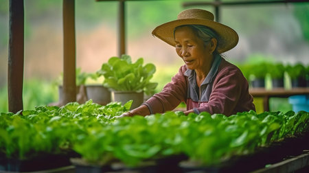 Using hydroponics and an organic technique, an Asian local farmer grows their own salad lettuce in a greenhouse for their family's company and harvests some for sale. GENERATE AI