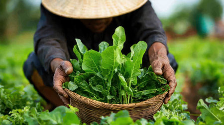 A person's weathered, wrinkled hands gently placing vibrant green leafy vegetables into a rustic woven wicker basket, wearing a traditional straw hat.