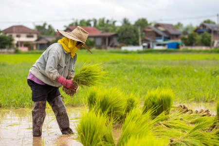 Transplant rice seedlings in rice field, Asian farmer is withdrawn seedling and kick soil flick of Before the grown in paddy field,Thailand, Farmer planting rice in the rainy season.