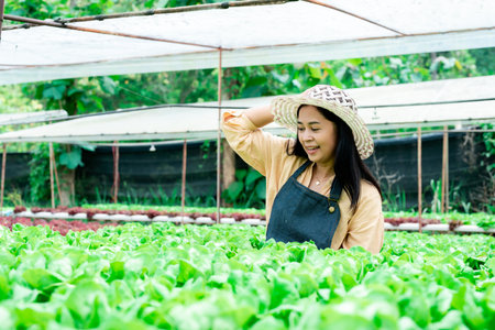 Asian woman who owns a hydroponics vegetable farm checks the quality of vegetables grown on the farm before harvesting them for sale. Growing vegetables using non-toxic methods.