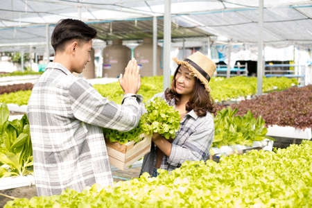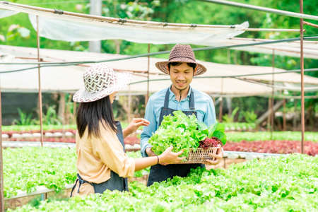 Hydroponics, smiling young Asian couple farmers harvest organic vegetable salad from farm garden, nursery. Organic farming business concept.