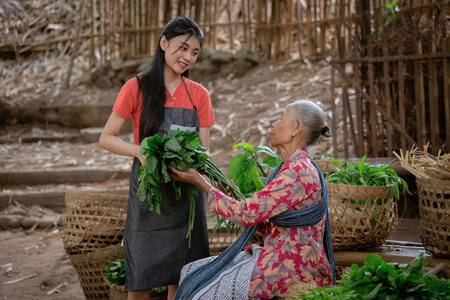 A young woman and an elderly lady share a delightful moment together over freshly harvested greens from the farm