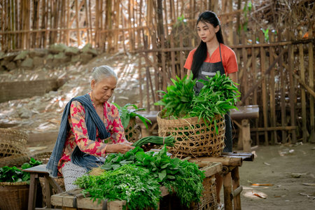 An elderly woman and a young girl are collaborating together while working with fresh greens in a rustic setting