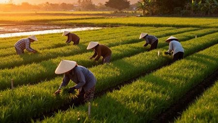 Dedicated farm workers carefully gather fresh lettuce in a vibrant green field under the sun. The scene captures the essence of agricultural labor.